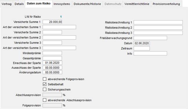 Allgemeiner Versicherungsvertrag: Karteikarte Daten zum Risiko