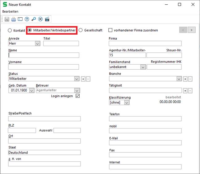 Ist der neue Kontakt Mitarbeiter Ihrer Agentur, wählen Sie