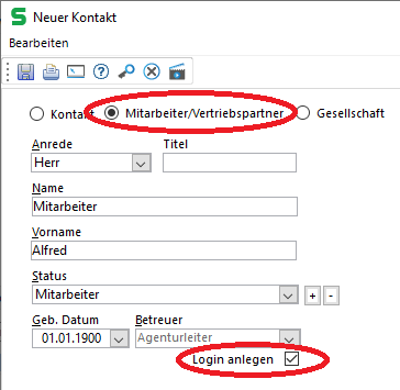Ein Mitarbeiter wird wie ein normaler Kontakt in SALIA® angelegt. Es muss jedoch „Mitarbeiter/Vertriebspartner“ ausgewählt werden. Damit erhält der Kontakt automatisch den Status „Mitarbeiter“.