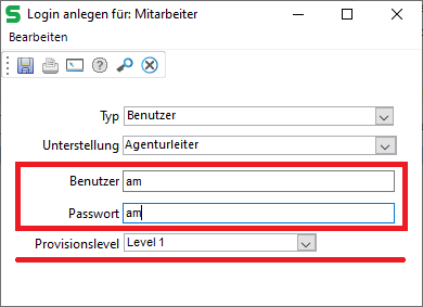 Hinweis: Der Provisionslevel ist standardmäßig auf „keines“ gesetzt. Soll der Mitarbeiter jedoch Verträge anlegen können, so muss ein Level eingestellt werden.