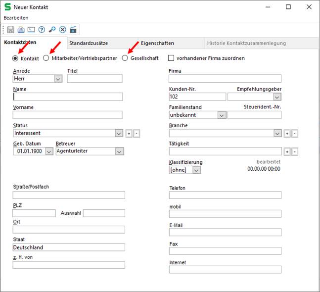 Wählen Sie hier aus, ob es sich bei dem anzulegenden Kontakt um einen Kunden, einen Mitarbeiter oder eine Gesellschaft (VU) handelt. Als Standard ist immer der Kontakt (Kunde) aktiviert. Die Ansicht des Fensters ändert sich je nach Auswahl.