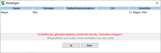 Wenn Sie einen neuen Kontakt speichern, wird geprüft, ob dieser oder ein ähnlicher Name bereits vorhanden ist. Wenn ja erfolgt eine extra Abfrage, welche Sie bestätigen oder verneinen müssen.