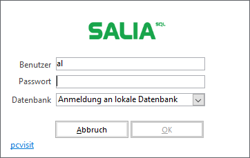 Beim Programmaufruf erscheint das unten dargestellte Fenster zur Anmeldung am System SALIA®. Hier muss jeder Benutzer von SALIA® seinen Benutzernamen und sein Passwort eintragen.