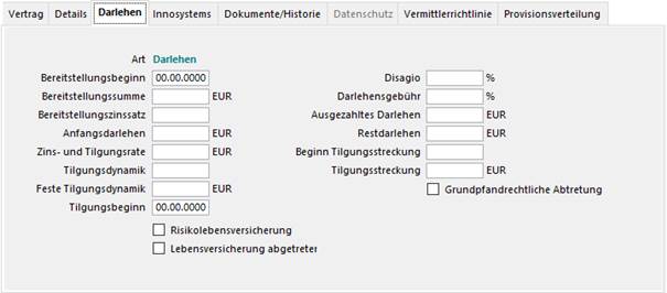 Die Karteikarte „Antrag“ bzw. „Sparen“ entfällt und wird durch die Karteikarte „Darlehen“ ersetzt, wenn als Vertragsart/-zustand: Darlehensphase eingetragen wurde.
