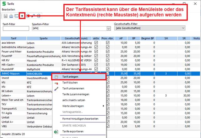 1. Aufruf des Fensters Tarifassistenten über das Menü Verwaltung – Tarife (Agentur)