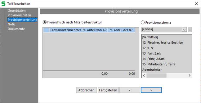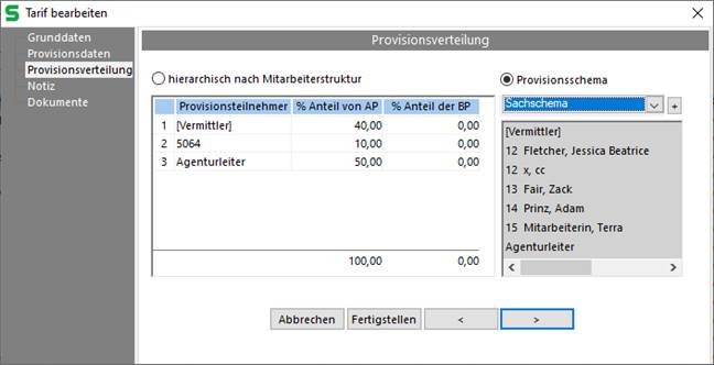 Radio-Button „Provisionsschema“. Damit wird die Tabelle der Provisionsteilnehmer