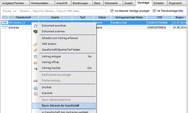 Rechtsklick auf einen Vertrag -> BIPRO: Extranet der Gesellschaft