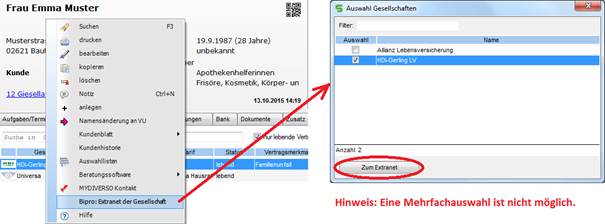 Das Kontextmenü des Kunden mit Rechtsklick aufrufen -> BIPRO: Extranet der Gesellschaft