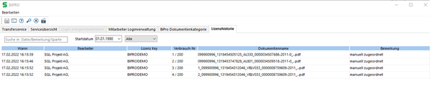 In der Lizenzhistorie können Sie die erworbenen Kontingente und deren Verrauch einsehen.