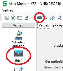| Briefe, die Informationen zu Verträgen enthalten, werden immer aus dem Vertrag heraus erstellt. Entweder nutzen Sie die Funktion „Brief“ im ExpressMenü oder das Briefsymbol in der Menüleiste.