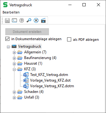 Es öffnet sich der Vertragsdruck, wo eine vorher angepasste Vorlage ausgesucht werden kann.
