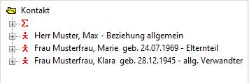 Sind im System Beziehungen zwischen dem aktuellen Kontakt und anderen Personen bekannt, werden diese im Beziehungsfeld dargestellt. Für Personen, zwischen denen eine Beziehung angelegt wurde, können Referenzen für Adressen, Bankverbindungen und Kommunikation erstellt werden.