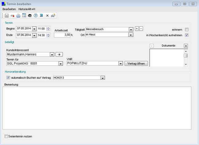 Es ist möglich Aufwände, die Sie als Aufgabe oder Termin erfasst haben, automatisch von SALIA® als Buchung am zugehörigen Honorarberatungsvertrag erfassen zu lassen. Wählen Sie dazu in der Aufgabe oder dem Termin den jeweiligen Honorarberatungsvertrag des Kunden aus und setzen Sie das Häkchen.