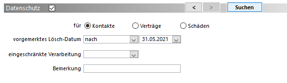Die eingeschränkte Verarbeitung ist für Kontakte oder Verträge bzw. Schäden nur über nein und ja einschränkbar.