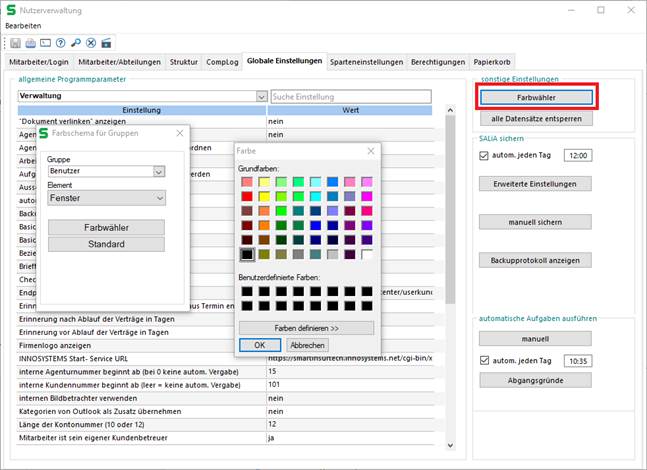 Es ist in SALIA® möglich einzelne Nutzergruppen durch Zuordnung einer eigenen Fenster- und/ oder Schriftfarbe gesondert zu kennzeichnen. Dazu wählen Sie die Schaltfläche „Farbwähler“.