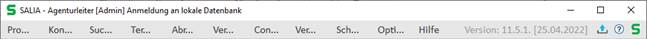 Die Titelleiste enthält den Namen des Anwendungsprogramms SALIA®, den Nutzernamen und den Status des angemeldeten Benutzers. Wenn mehrere Fenster geöffnet sind, wird das aktive Fenster mit einer anderen Farbe der Titelleiste kenntlich gemacht. So kann der Anwender das aktuelle Fenster von den anderen Fenstern unterscheiden.