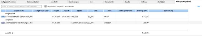 Die Karteikarte Anträge/Angebote enthält alle die Verträge des aktiven Kontaktes, die noch nicht policiert wurden. Dabei wird zwischen Angeboten, die für den Kunden erstellt wurden und beim Versicherungsunternehmen eingereichten Geschäften unterschieden.