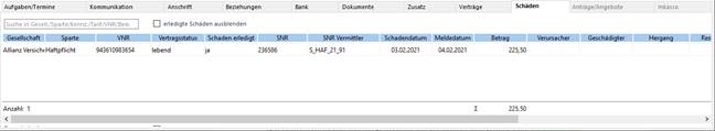 Die Karteikarte Schäden listet die zu den Versicherungsverträgen gemeldeten Schadensfälle des aktiven Kontaktes auf.