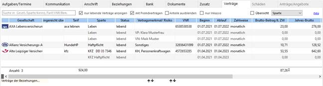 Diese Karteikarte enthält alle gültigen Verträge, die zwischen Ihnen und dem aktuellen Kontakt abgeschlossen wurden. Bis zur Polisierung gelten Verträge als eingereicht und werden neben den Angeboten in einer gesonderten Karteikarte Anträge/Angebote aufgeführt.