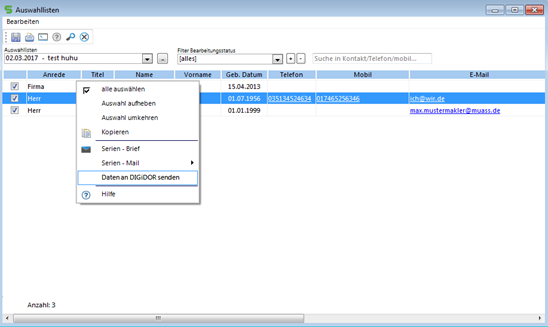 4. In der Auswahlliste per "Rechtsklick → Daten an DIGiDOR senden" die Kontakte an DIGiDOR übertragen.