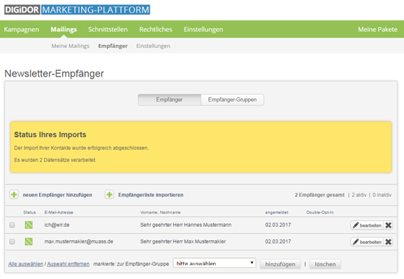 Im SALIA® hinterlegte Auswahllisten (früher Mailings) werden an die Marketingplattform DIGiDOR übertragen.