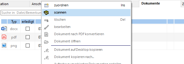 Über das Kontextmenü steht Ihnen ein Menüpunkt zur Verfügung, mit dem Dokumente direkt aus dem System SALIA® heraus gescannt werden können.