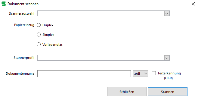 Wenn das Scannermodul NAPS2 unter „Optionen“ -> „Persönliche Einstellungen“ -> Standardeinstellungen aktiviert wurde, können mehrseitige Dokumente gescannt werden. Das Fenster für den Dokumenten Scan sieht dann wie folgt aus: