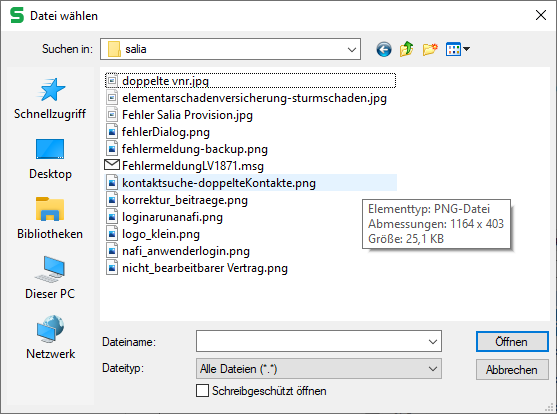 Hier wählen Sie den Pfad und den Dateinamen des gewünschten Dokumentes aus und bestätigen Sie Ihre Auswahl mit der Schaltfläche "Öffnen". Bei diesem Vorgang wird im Ablageverzeichnis von SALIA® eine Kopie des Originaldokumentes erstellt. Gegebenenfalls wird das Originaldokument mit der Zuordnung gelöscht, wenn Sie in den Standardeinstellungen unter "Persönlichen Einstellungen" entsprechende Angaben gemacht haben.