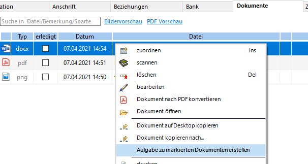 "Aufgabe zum Dokument erstellen" im Kontextmenü