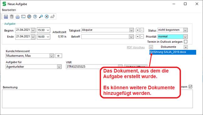 Dokumentenverwaltung heraus, eine neue Aufgabe erstellen, in der das Dokument