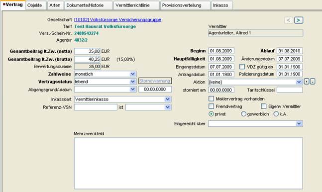 Der Vertrag im Beispiel 1 würde z. B. ab dem 1.8.2009 jeweils zum 1ten eines Monats ein Jahr lang mit einem Betrag von 40,25 € fällig werden.