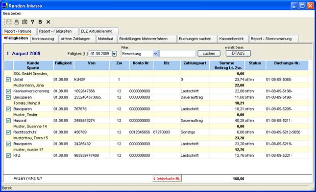 Fehlerhafte BLZ oder Kontonummern können das Erstellen einer DTA-Datei verhindern. Nicht konforme BLZ oder Kontonummern werden Ihnen deshalb schon in der Zusammenfassung der Ergebnisliste angezeigt. Korrigieren Sie die Eingaben bevor Sie fortfahren.