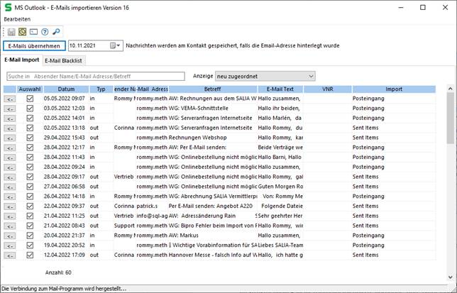 Über die Schaltfläche "E-Mails übernehmen" wird der eigentliche Datenimport gestartet. Bei diesem Vorgang werden alle die Nachrichten der im SALIA® - System verwalteten Kontakte übernommen, die anhand ihrer E-Mail- Adresse als gültig erkannt, und noch nicht importiert wurden.