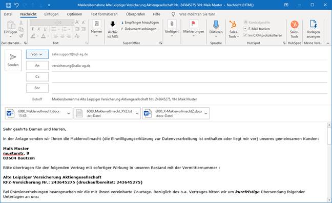 Wenn „Maklervollmacht anhängen“ aktiviert wird, werden alle Dokumente des Kunden, die im Namen „Maklervollmacht“ enthalten mit an die E-Mail angehängt.