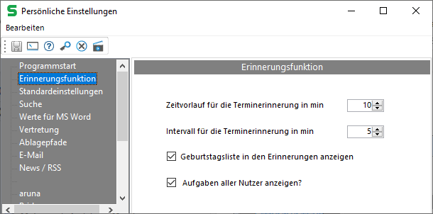 Die Erinnerungsfunktion von SALIA® bietet Ihnen an, Sie während Ihrer Arbeit mit dem System auf unmittelbar anstehende Termine hinzuweisen. Sie wird aktiviert, indem Sie in das Feld "Zeitvorlauf" einen Wert eintragen. Weitere Hinweise zur Erinnerungsfunktion finden Sie im Kapitel Terminerinnerung.