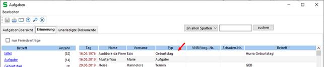 Geburtstagsanzeige in Erinnerungsliste, Bsp.: 16.10