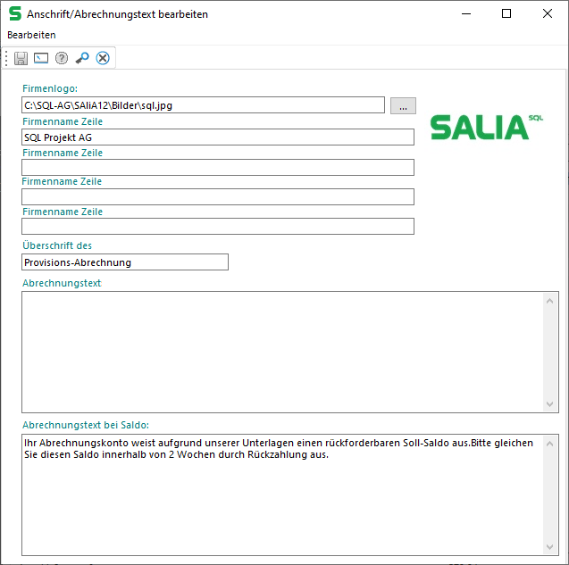 Beispielansicht Provisions-Abrechnung mit den, in Anschrift und Abrechnungstext bearbeiten eingegebenen Daten