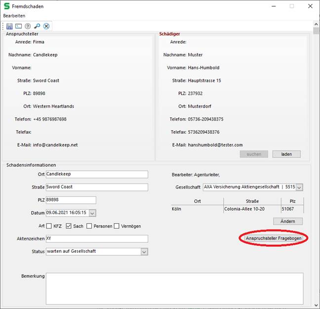 Die Vorlagen im Unterordner Fremdschaden werden herangezogen, wenn Sie beim Erstellen eines Fremdschadens die Schaltfläche „Anspruchsteller Fragebogen“ betätigen.