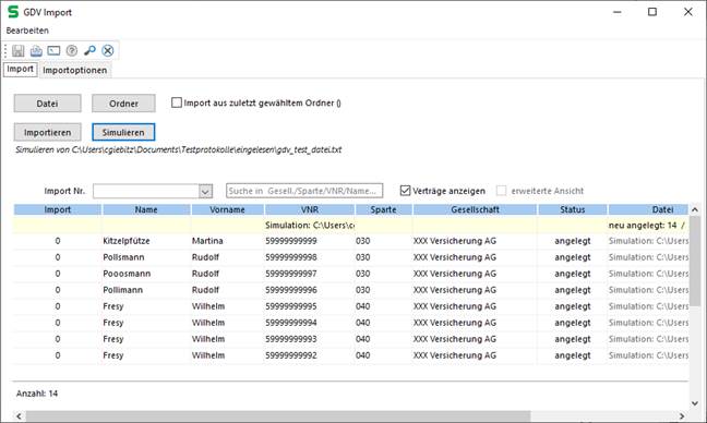 Über die Schaltfläche „Simulation“ kann die Datenübernahme vor dem Import der aktuellen GDV- Daten getestet werden. Damit haben Sie die Möglichkeit, Einsicht in die neuen Datensätze zu nehmen, bevor die Daten endgültig übernommen werden. Das ist hilfreich, um zu testen, was bei der Datenübernahme passieren würde, ohne dabei den Datenbestand zu verändern.