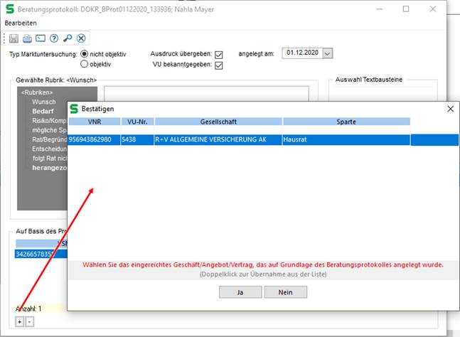 Eine weitere Möglichkeit, eine Verknüpfung zwischen Geschäft und Beratungsprotokoll herzustellen, bietet SALIA® direkt im Vertragsfenster auf der Karteikarte "Vermittlerrichtlinie".
