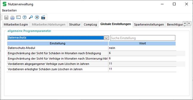 | Vordatieren abgegangener Verträge zum Löschen in Jahren | 11 | Ist das Modul angeschaltet, werden Verträge, laut Vorbelegung 11 Jahren nach Stornierung oder Ablauf, automatisch gelöscht. |