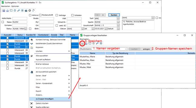 Mit dieser Funktion lassen sich mehrere Personen zu einer Gruppe zusammenfassen (z.B. die Ansprechpartner einer Firma oder VUs, die eine bestimmte Sparte versichern).