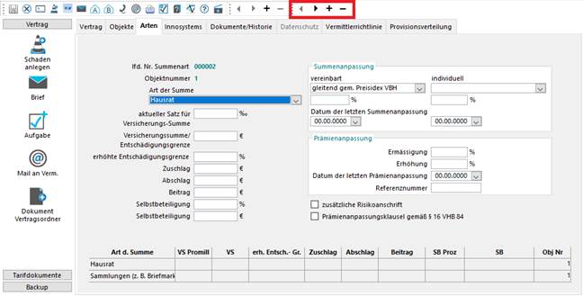 Summenarten werden über + und – im Menü angelegt oder gelöscht. Der Wechsel zwischen den Summenarten erfolgt über die Pfeile.