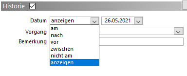 Die Drop-Down-Box „Vorgang“ enthält eine Liste aller selektierbaren Vorgänge. Der Eintrag „Telefoniert“ z.B. beschränkt die Liste auf alle eingetragenen Telefonate.