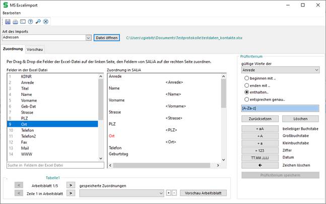 Im Anschluss können die Prüfkriterien definiert werden. Wechseln Sie dafür in den Vollbildmodus des Import- Fensters! Lesen Sie im Kapitel Import von Daten aus MS Excel- Tabellen nach, wie Sie Prüfkriterien definieren können.