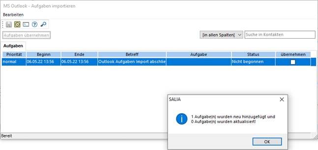 Bei Aufruf dieser Funktion wird Ihnen eine Liste aller in MS Outlook vorhandenen Aufgaben zur Auswahl angeboten. Sie markieren die Aufgaben, die sie in das SALIA® - System übertragen möchten, indem Sie das jeweilige Kontrollfeld in der Spalte "übernehmen" in der entsprechenden Zeile aktivieren.