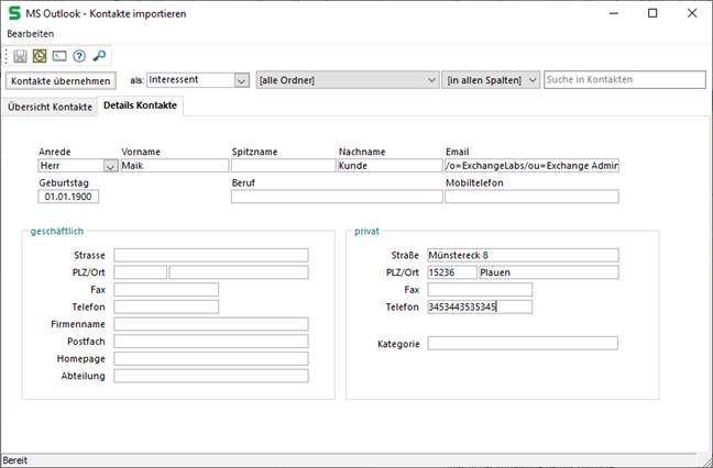 Dabei werden alle Kontakte, die für die Datenübernahme gekennzeichnet wurden, aktualisiert bzw. als neuer Eintrag in das Zielsystem geschrieben.