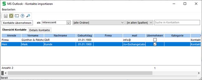 Markieren Sie in der Spalte „übernehmen“ die Kontakte, die importiert werden sollen.