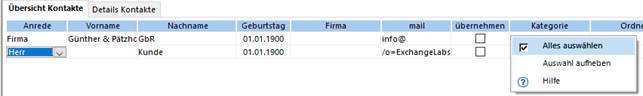 Über das Kontextmenü können sofort alle angezeigten Kontakte für den Im- bzw. Export ausgewählt oder alle bisher ausgewählten Kontakte wieder deaktiviert werden.