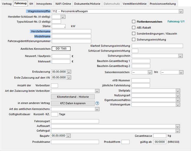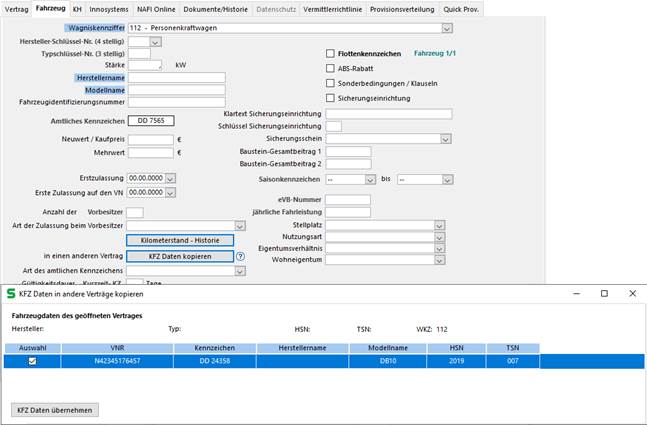 Die Funktion ist für Flottenverträge gedacht, bei denen die Fahrzeugdaten (HSN, TSN, Herstellername, Modellname, WKZ) auf andere bestehende Verträge des Kunden übertragen werden sollen.